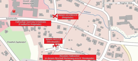 Aufgrund von Arbeiten am Kindergarten St. Franziskus sowie Arbeiten an den Trinkwasserleitungen in der „Schulstraße“ ist diese voll gesperrt von der Abzweigung „Herrngasse“ bis zum Parkplatz Friedhof sowie halbseitig gesperrt vom Parkplatz Friedhof bis zur Abzweigung „Ringstraße“. Nach aktuellem Kenntnisstand werden die Bauarbeiten zwischen Parkplatz Friedhof und Abzweigung „Ringstraße“ bis längstens Freitag, den 26.03.2021 andauern.