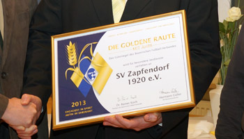 4.400 Fußballvereine gibt es in Bayern. Erst 43 davon erhielten die Goldene Raute mit Ähre, die höchste Auszeichnung des Bayerischen Fußball-Verbandes (BFV). In Oberfranken ist der SV Zapfendorf der zweite, im Spielkreis Bamberg/Bayreuth/Kulmbach gar der erste. Dementsprechend stolz zeigten sich die Verantwortlichen beim SV Zapfendorf, als Günther Bardutzky, Bezirksehrenamtsreferent für Oberfranken, die Urkunde an Matthias Schneiderbanger und den Ehrenamtsbeauftragten des SV Zapfendorf, Jürgen Betz, überreichte.