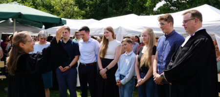 Am Vormittag hatte es noch keineswegs so ausgesehen, als ob alles wie geplant stattfinden kann. „Gottesdienst im Pfarrgarten“ stand auf der Einladung, der aktuell oft verregnete Juli machte dem aber fast einen Strich durch die Rechnung. Aber eben nur fast. Und so zog Kornelius Holmer am Sonntag, 27. Juli 2025 um 14 Uhr mit vielen Kolleginnen und Kollegen aus dem Umkreis, mit Vertretern der Kirche und der politischen Gemeinde, zum Abschiedsgottesdienst in den Pfarrgarten ein.
